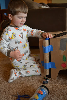 2. cardboard boxes- We spent almost four hours the other day destroying a cardboard box and making it into a garage with a launch ramp and a vertical tunnel. The down side: it still is taking up way too much space in our living room.